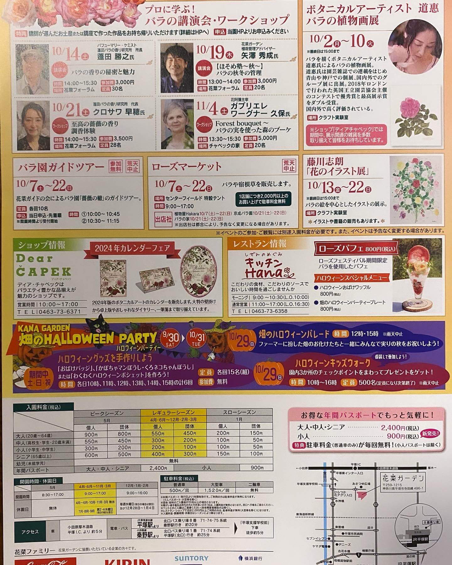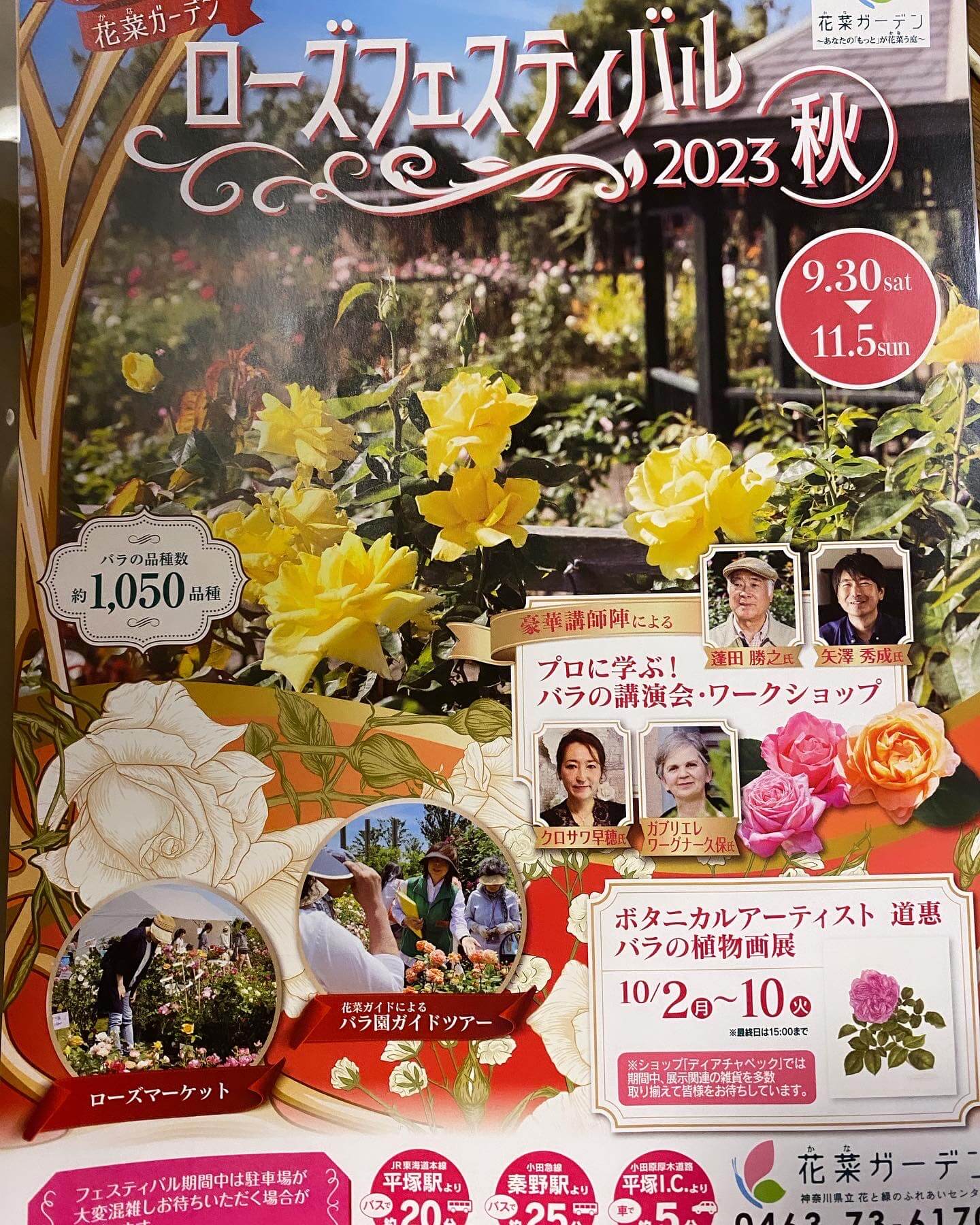 2023.10.16 活動日誌 花菜ガーデン 秋バラのイベント 花菜ガーデンの秋バライベントのチラシです。 見ごろは今週あたりから~とのことです。 秋バラは香りが素晴らしい! 朝晩の寒暖差、湿度などで香りの状態も変わると言われています。 また午前中の香りがみずみずしくて香りも強い。週末のお散歩に是非お出かけください♪